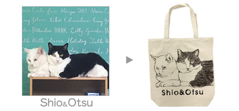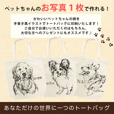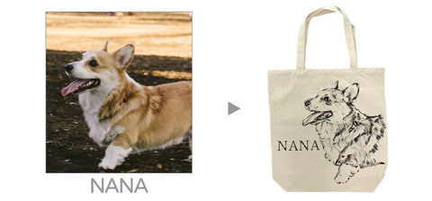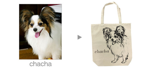 ペットちゃんのお写真をデザイナーがイラストに書き起こして一点一点丁寧にトートバッグにプリントさせていただきます!